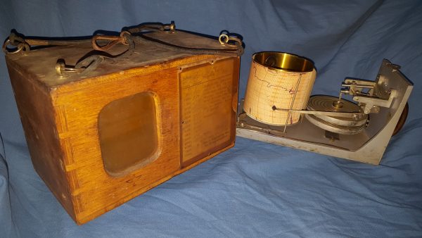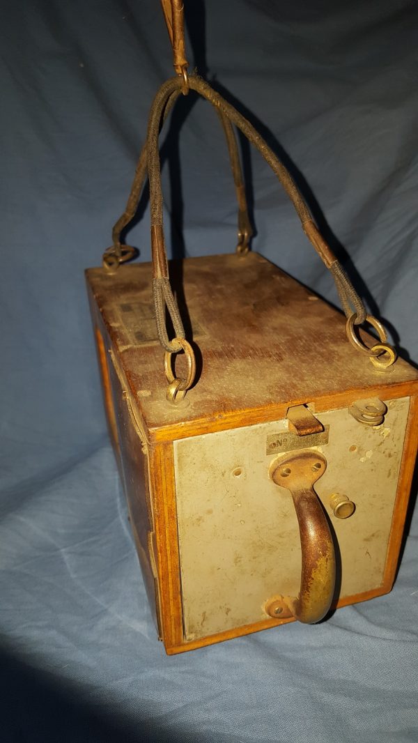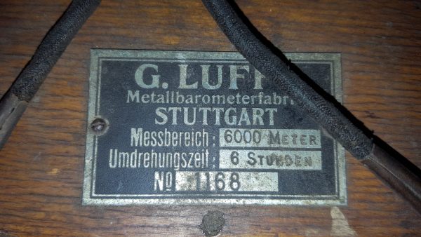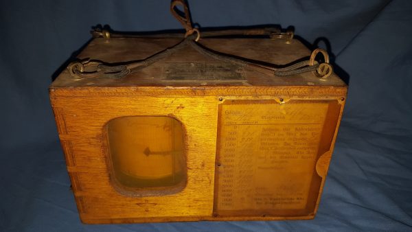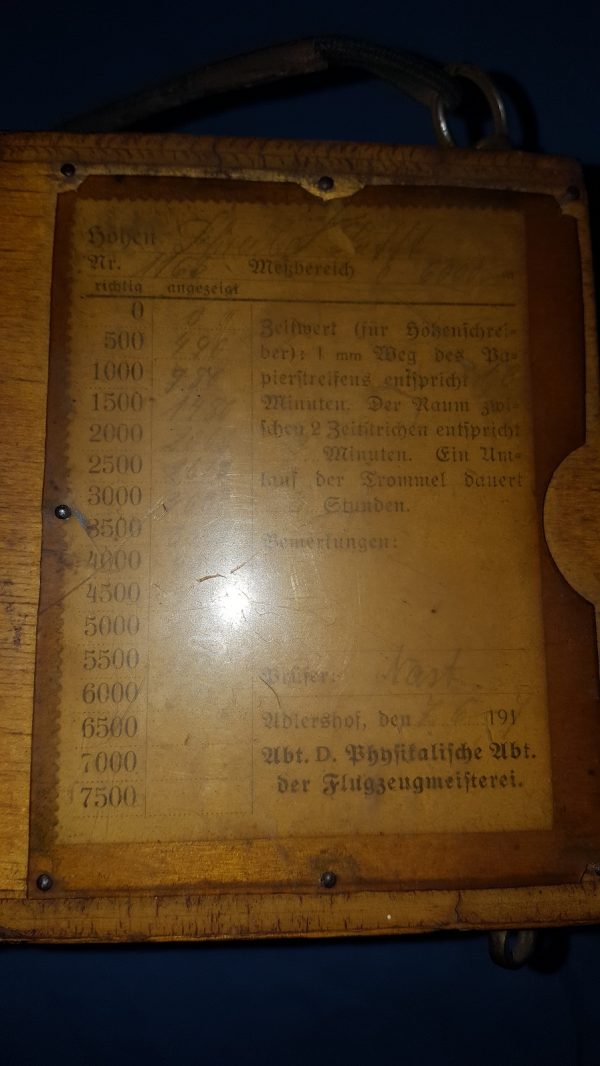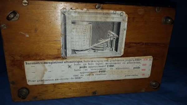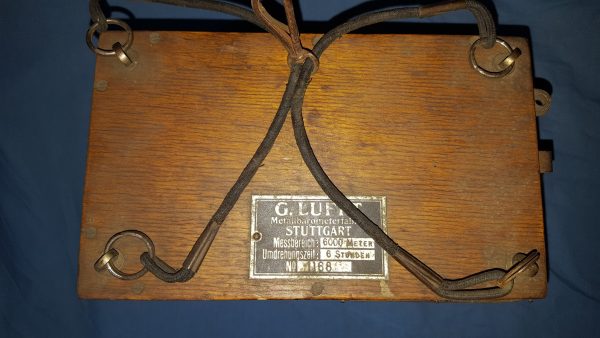 Flugzeug-Höhenschreiber instrument de vol de la grand guerre ; As des As ; pilote, montre chrono; Barographe numéroté 1188 (boite et mécanisme) fabriqué par la société G LUFFT de STUTTGART, sa plaque d’épreuve en papier jusqu’à 6000 m daté 1917 et avec ses cordes élastiques d’origine sur le haut en caoutchouc ‘élastique’ enveloppées de tissu (mousqueton de fixation d’origine). Marquage au pyrograveur sur la façade avant au logo de l’armée de l’air de la grande guerre (hélice ailée). Le mécanisme interne était réglé, le ressort remonté avec sa clef, puis glissé dans sa boîte en bois, verrouillé et fixé aux ailes de l’aéronef, cockpit ou nacelle de dirigeable. Juste avant de monter dans son poste de pilotage, le pilote actionnait un interrupteur à l’extérieur de la boîte pour lancer la rotation lente du tambour d’enregistrement. À mesure que le pilote prenait de l’altitude, le stylet du tambour s’élevait et enregistrait son altitude. Une fois le pilote de retour à son aérodrome, on peut lire le rouleau de papier pour déterminer à quelle hauteur il a volé. Sur une photo d’époque, on voit un instructeur de vol lire ce document d’enregistrement. Sur une autre, l’instrument est suspendu à l’aile supérieure d’un bombardier A.E.G G.III (bombardier biplan, bimoteur triplace) face au pilote. Ce modèle d’altimètre est répertorié dans le livre « Flugzeuginstrumente » du Dr. Kurt Bennewitz, imprimé à Berlin en 1922. Le modèle proposé ici avec ces tendeurs amortisseurs de choc d’origine le rend extraordinairement rare. Il a certainement fait l’objet d’un commerce au titre des dommages de guerre comme le prouve les étiquettes en français apposées dessous ; à noter leur état de préservation irréprochable.